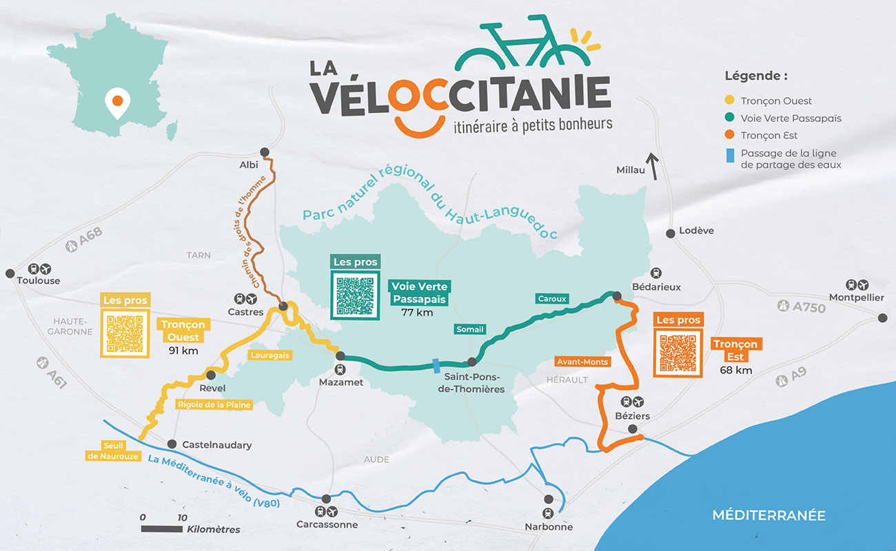 La Véloccitanie (V84) est un itinéraire cyclable de 237 km, qui rejoint le Canal des 2 mers à vélo (V80) de part et d’autre, en parcourant les terres du Lauragais, les paysages du Haut-Languedoc et les vignes du Faugérois et du Saint-Chinianais.