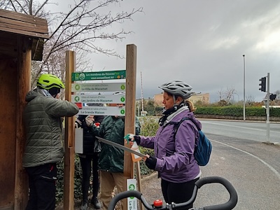 Sur 3 journées (avril et juin), des membres du Conseil d’administration on arpenté à vélo toute la Passapaïs armés de chiffons, savon noir, visseuse, pinces, ainsi que de la liste des panneaux situés sur les 77 km de la voie.